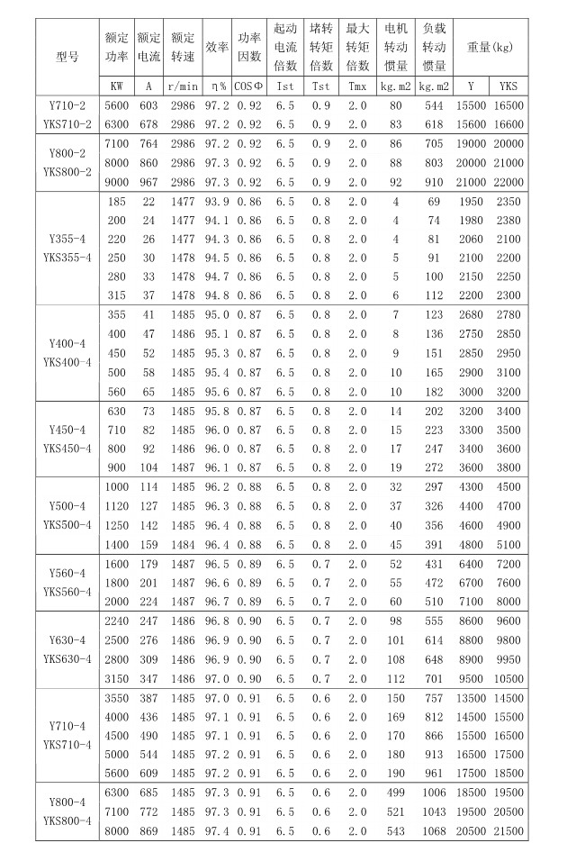 1 概述 YKK、Y、YKS 系列高压三相异步电动机(机座号355~1120)是我公司在引进吸收消化国外先进技术的基础上,结合我公司长期稳定生产高压三相异步电动机的设计制造经验而开发的新一代产品。 本系列电动机选材考究、制造精良、具有体积小、重量轻、功率大、效率高、噪声低、振动小、运行安全可靠、使用维护方便、节能环保等特点。 本系列电动机符合以下标准和规范 GB755 《旋转电机定额和性能》 GB/T13957 《大型三相异步电动机基本系列技术条件》 JB/T7593 《Y 系列高压三相异步电动机技术条件(机座号355-630)》 JB/T10315.1 《YKS、YKS-W、YQF 系列高压三相异步电动机技术条件(机座号 355-630)》 JB/T10315.2 《YKK、YKK-W 系列高压三相异步电动机技术条件(机座号355-630)》 GB10069.3 《旋转电机噪声测定方法及限值第 3 部分:噪声限值》 GB10068 《中心高为56mm及以上电机的机械振动振动的测量及限值》 2 型号说明